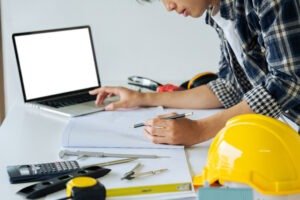 Engineer are planning a structure sketch with circular tools. Complete with architect equipment and architectural blueprints at the desk.